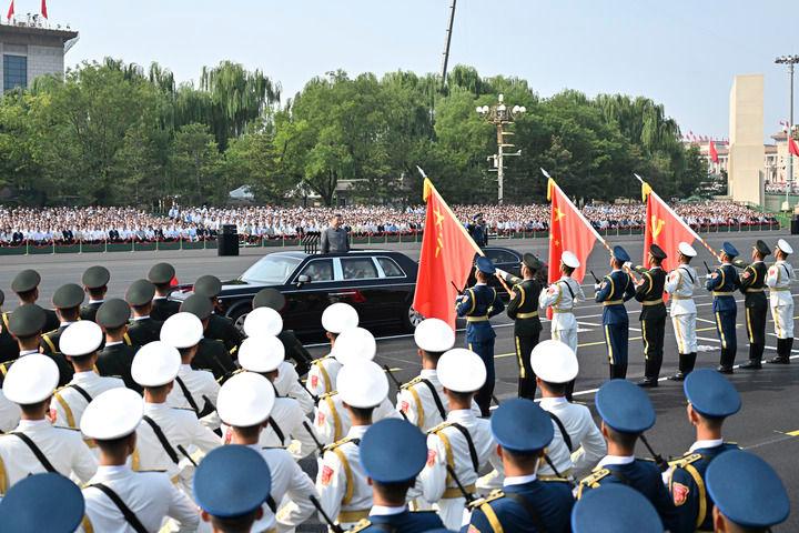 雄壯的軍樂聲中,習近平乘車沿著寬闊的長安街,依次檢閱13個徒步方隊、1個戰旗方隊、22個裝備方隊。受閱部隊軍容嚴整、意氣風發,鐵甲戰車整齊列陣、威風凜凜。這是人民軍隊奮進建軍百年的嶄新亮相,這是中華民族捍衛世界和平的堅定宣示。